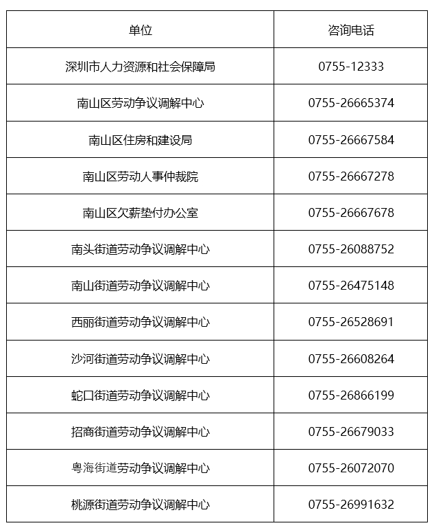 企业和职工均可致电深圳市南山区人力资源局(电话:26576148),咨询用工过程中出现的问题,区人力资源局将竭诚指导服务。也可以按需求、分片区,通过以下方式寻求帮助: