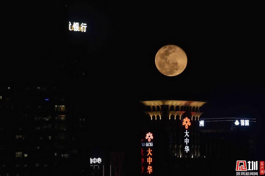 “超级月亮”出现在福田区上空。(图为二次曝光)