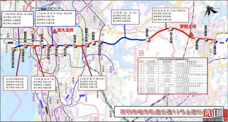 6、深圳市城市轨道交通13号线所在的石鼓站已实现全面复工复产。目前项目已完成土石方开挖90%,预计2022年底竣工并投入运营。项目共设车站16座,线路总长22.436公里,出入线与后海站接轨,将穿越已运营的地铁1号线、2号线、5号线、11号线。