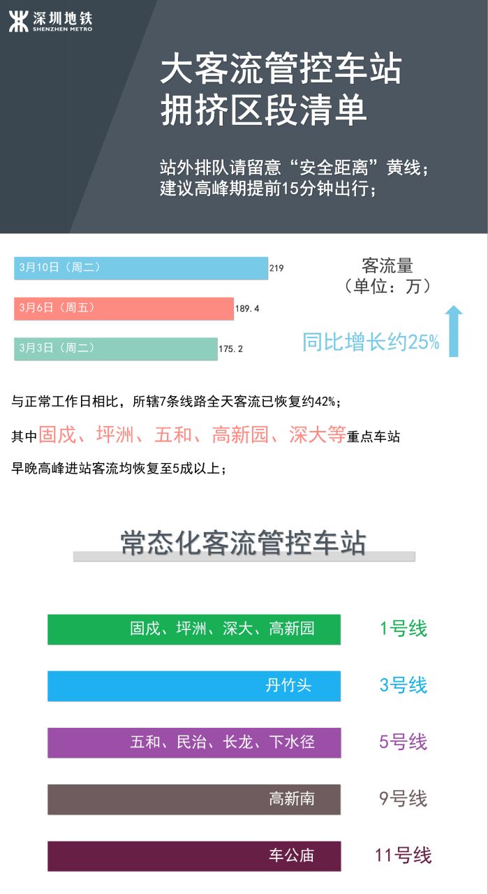 3月10日(周二),深圳地铁所辖7条线路客流量已达219万人次,为防止客流激增而造成乘客过度拥挤,深圳地铁已在11座大客流站点,实行常态化客流管控。另外有17座重点车站,也将视客流情况随时采取客流管控措施。
