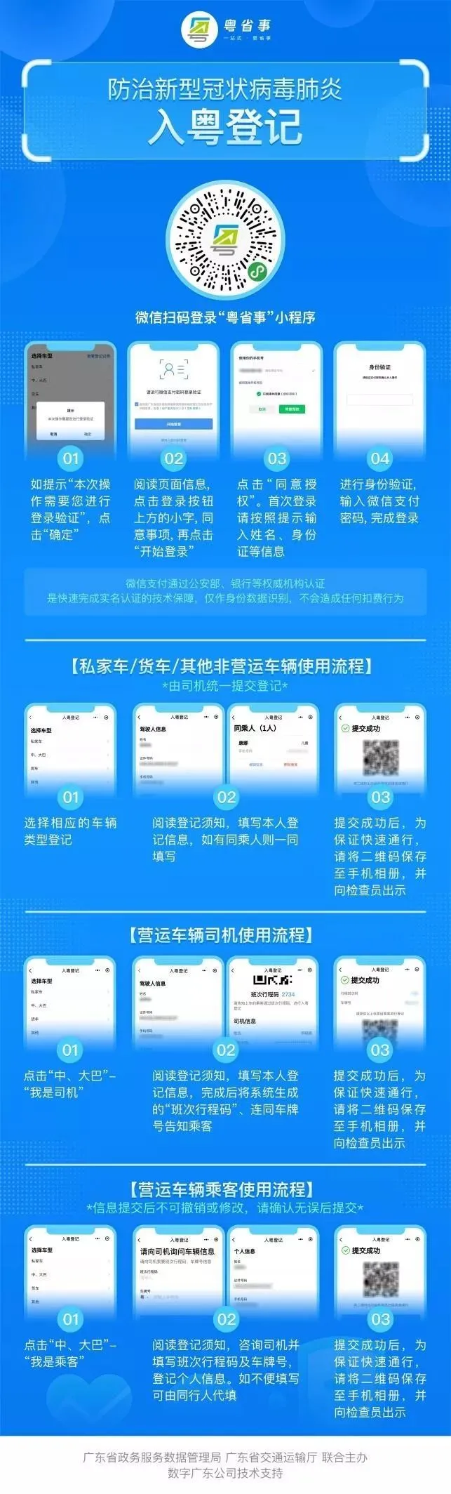 根据新冠肺炎防控指挥办要求,进入广东的车辆必须进行“入粤登记要对每辆车车牌、驾驶员姓名、出发地、目的地、乘车人数以及相关防疫所需的信息(如14天内的健康状况)等进行登记。