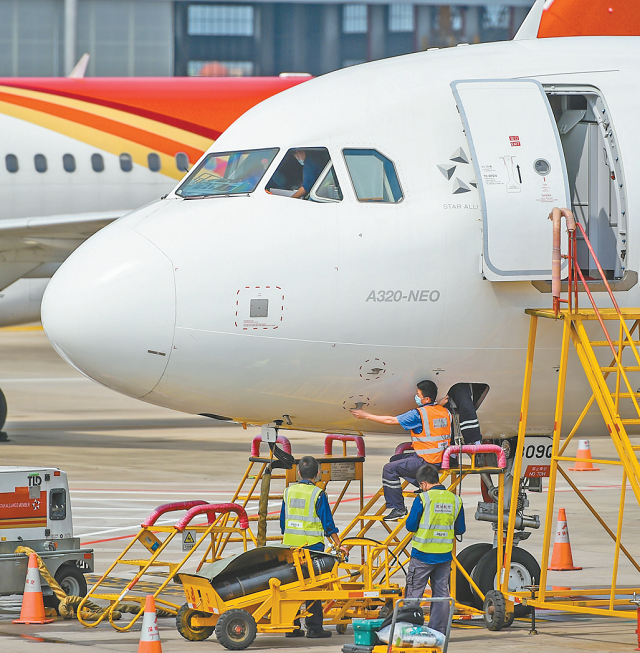 近日,随着航班陆续恢复,深圳航空的客机保障检修工作也持续进行。图为机场技术人员对深航客机进行维护保障。