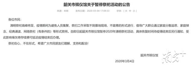 据统计,截至3月15日17时,深圳、汕头、中山等地发文明确,全市暂停祭扫服务,倡导通过家庭追思、网络祭扫、书写寄语等方式遥祭先人、慎终追远。此外,韶关市殡仪馆暂停2020年清明祭祀活动。