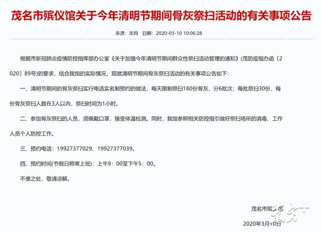 此外,梅州等地发布通知,可提供限制性祭扫服务。茂名市殡仪馆提供限制性祭扫服务,祭扫实行电话实名制预约。