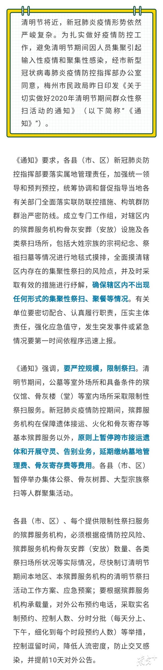 梅州提出,清明节期间,公墓等室外场所和具备条件的殡仪馆、骨灰楼(堂)等室内场所采取限制性祭扫服务。各县(市、区)、每个提供限制性祭扫服务的殡葬服务机构,要根据殡葬服务机构承载量,对外公布预约电话,采取实名制预约、控制人数、分时分批等举措,控制逗留时间,降低人流密度,防止交叉感染,并提前10天对外公告。