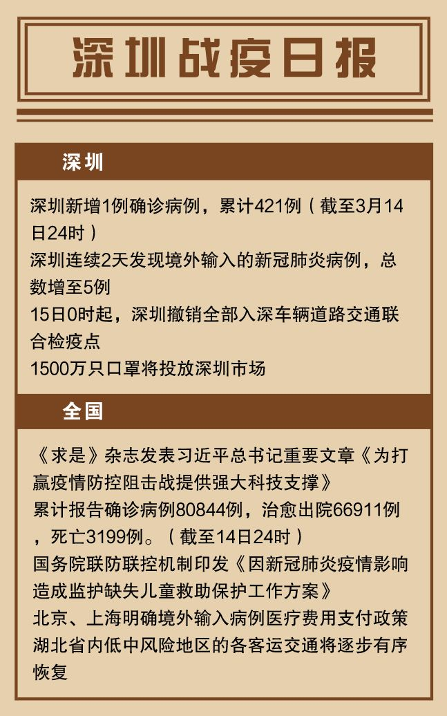 ①深圳连续2天发现境外输入的新冠肺炎病例,总数增至5例。第五例于3月15日凌晨被确诊,患者从瑞士返回中国,经深圳湾口岸入境后被送院,随后被确诊。