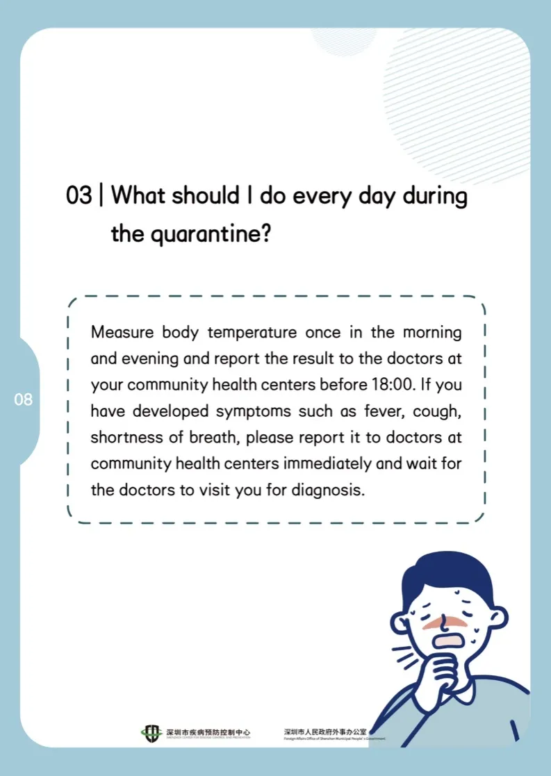 应在早、晚各测量一次体温,并于每天18∶00时前报告给社康医生。如果出现有发热、咳嗽、气促等症状,应立即向社康医生报告,社康医生会上门诊断。