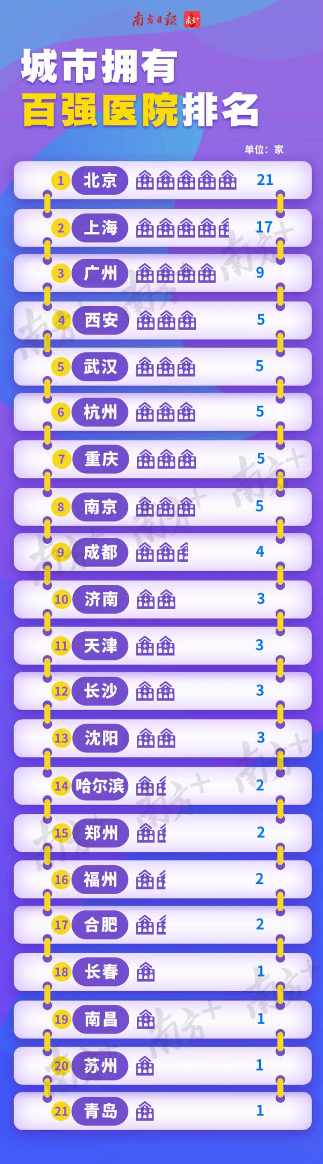 南方经济智库梳理后发现,全国排名前100的医院中,47所被北京、上海、广州囊括。前10个城市包揽几乎总数80%的百强医院。