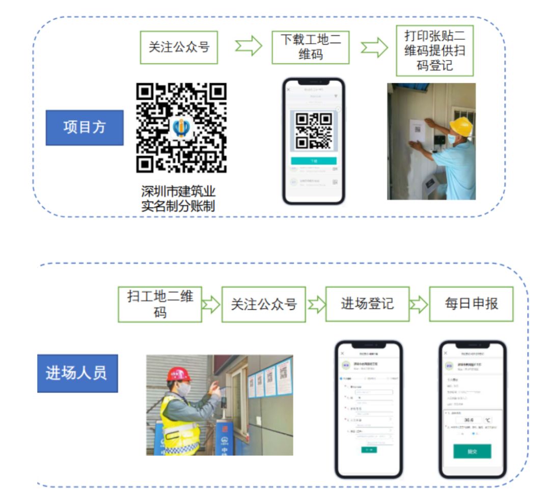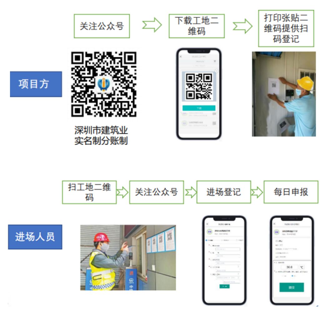 市场建设单位应关注深圳市建筑业实名制分账制微信公众号,获取本工地的微信二维码,并将工地二维码张贴至工地公示区域。施工人员每日进场前测温后,扫码申报个人测温结果和健康状况。