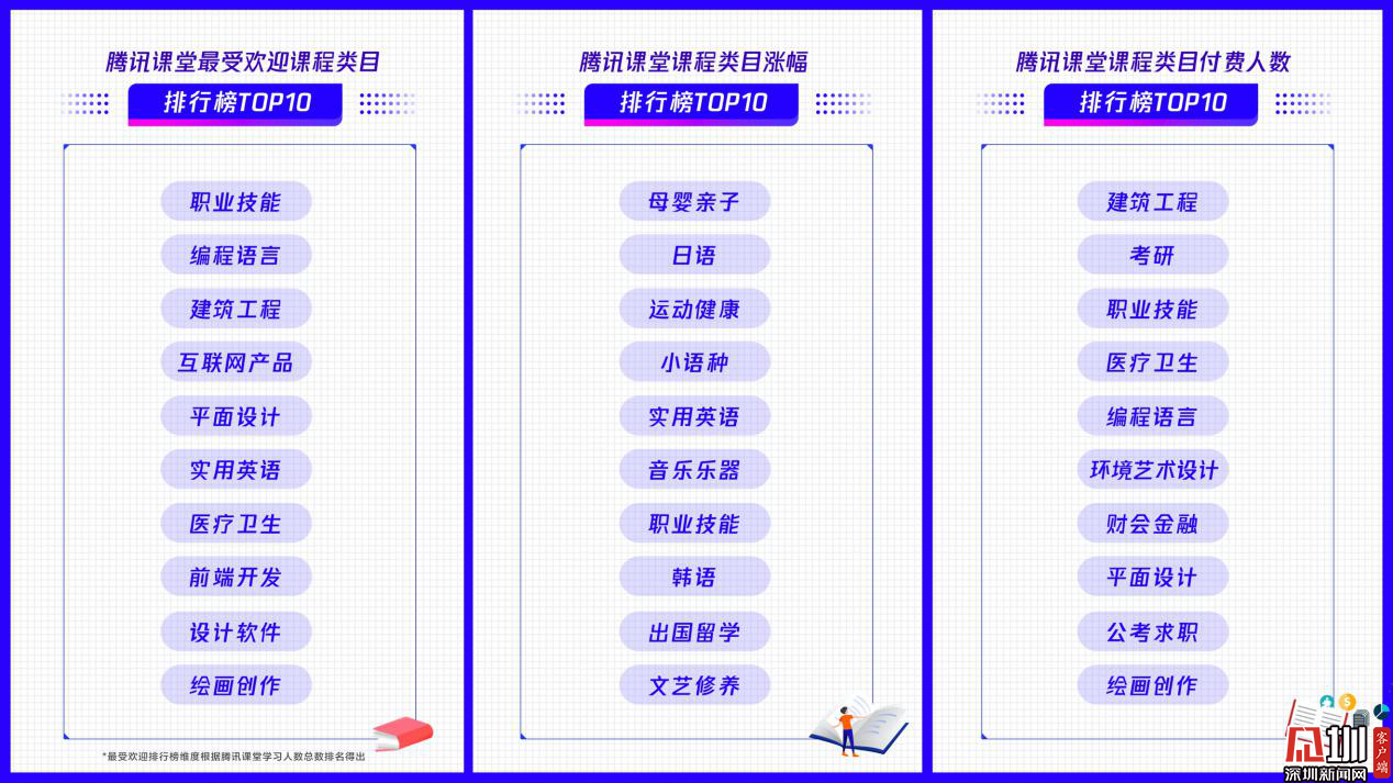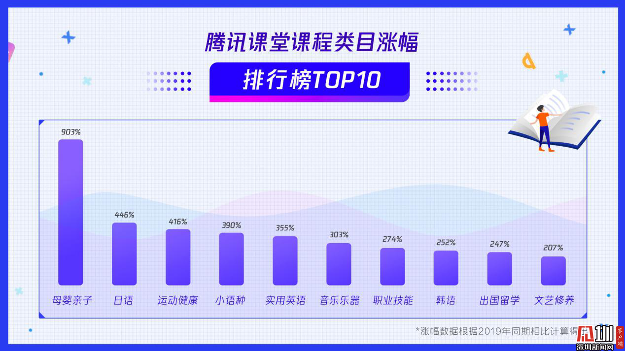见圳客户端·深圳新闻网2020年3月18日讯(见圳客户端、深圳新闻网记者 刘梦婷)近日,在线职业教育平台腾讯课堂发布数据报告:战“疫”宅家期间,该平台上课总时长提升3.5倍。同时,腾讯课堂还发布了最受欢迎课程类目(学习人数)排行榜TOP10:职业技能、编程语言、建筑工程、互联网产品、平面设计、实用英语、医疗卫生、前端开发、设计软件、绘画创作。此外母婴亲子、日语、运动健康等课程学习人数同比涨幅均超过400%,成腾讯课堂增速最快类目,或成为未来在线职业教育新的增长点。IT互联网就业类课程、工业产品设计类课程付费能力强,付费人数同比涨幅超过50%。