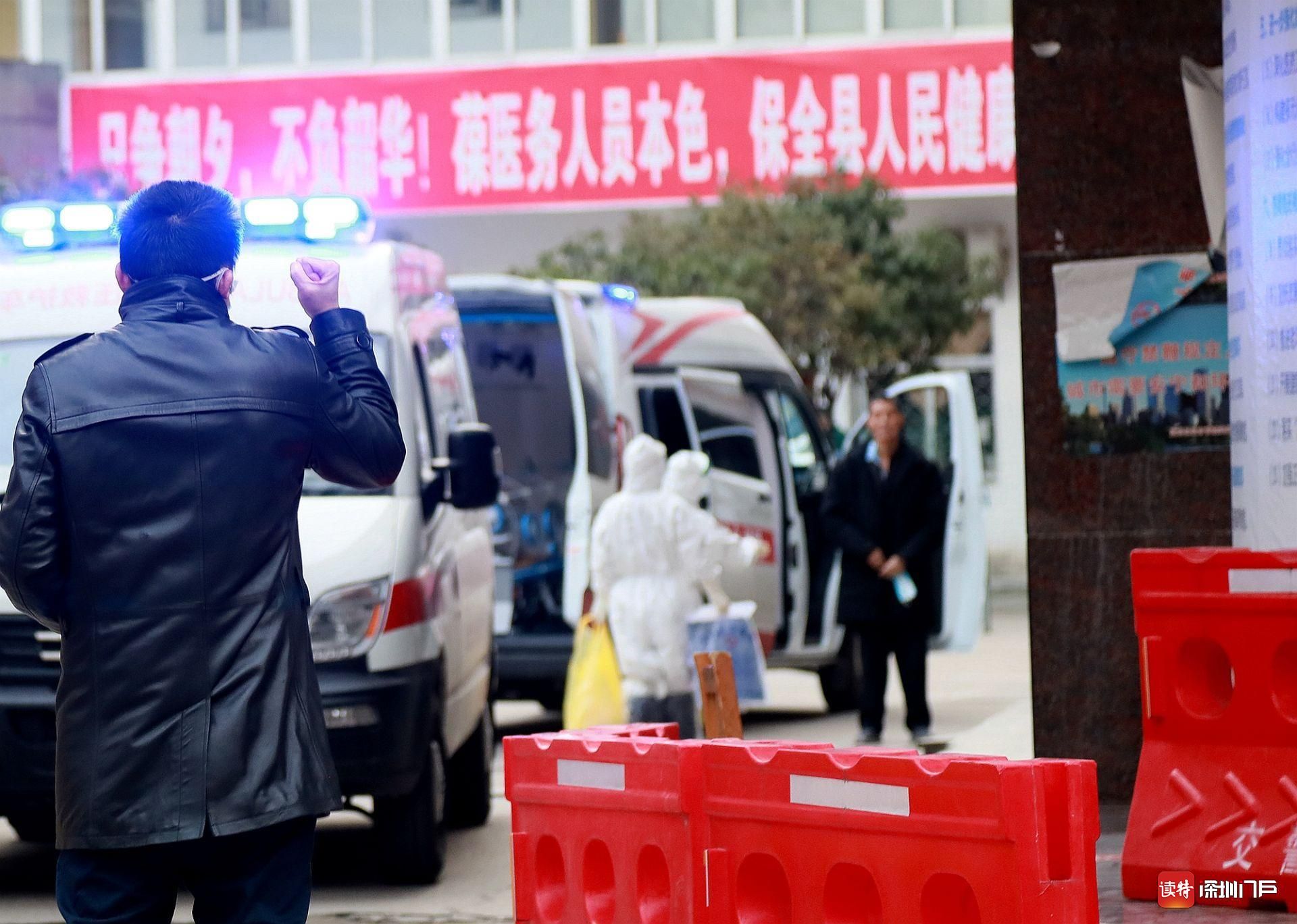 2月29日,监利县中医院,一位重症患者即将转往荆州救治。患者的儿子闻讯赶来,远远地向父亲举起拳头,高喊“加油”。