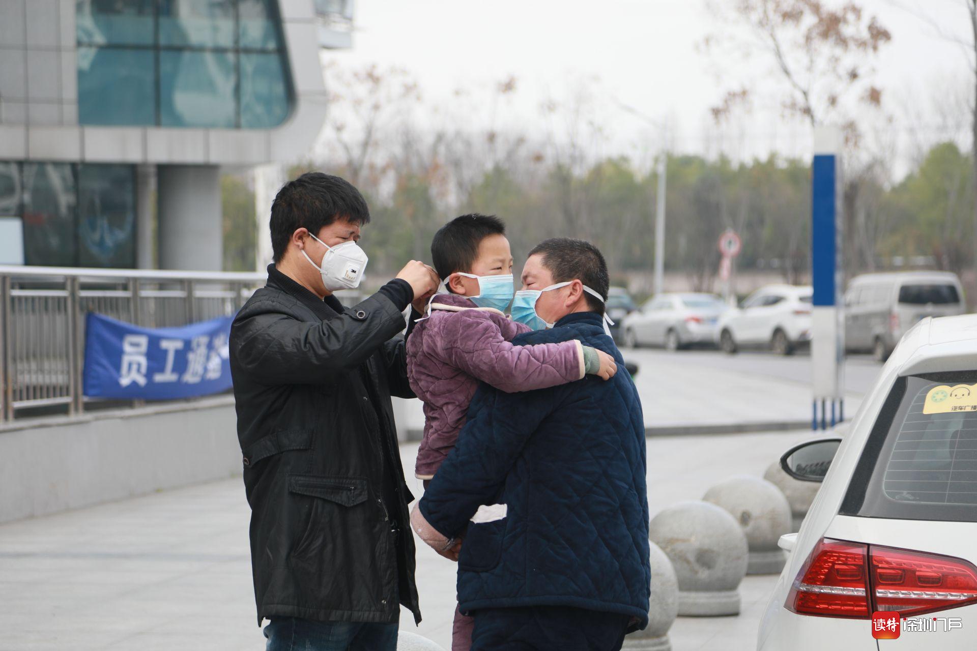 2月19日,监利,一位父亲帮助年幼的孩子戴口罩。