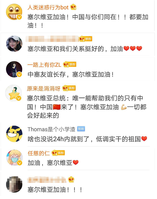 中国网友纷纷替塞尔维亚加油。