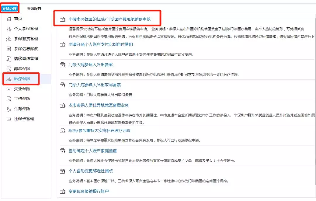 点击“在线办理”,按照指引选择“医疗保险”;点击“申请市外就医的住院/门诊费用报销预审核”;