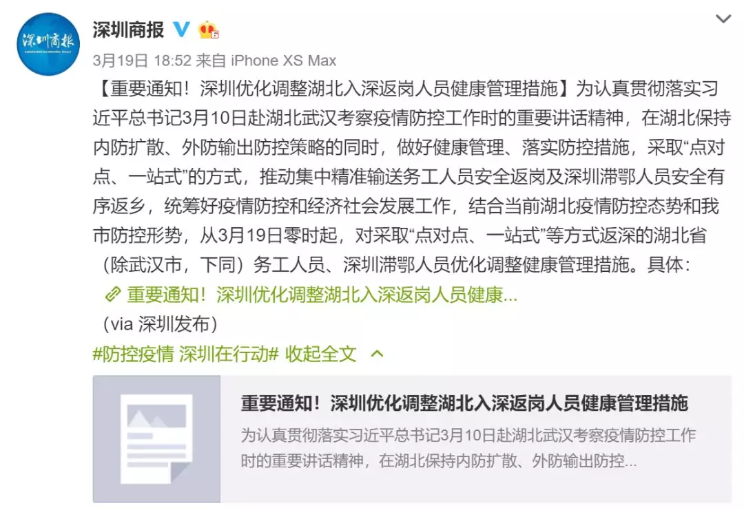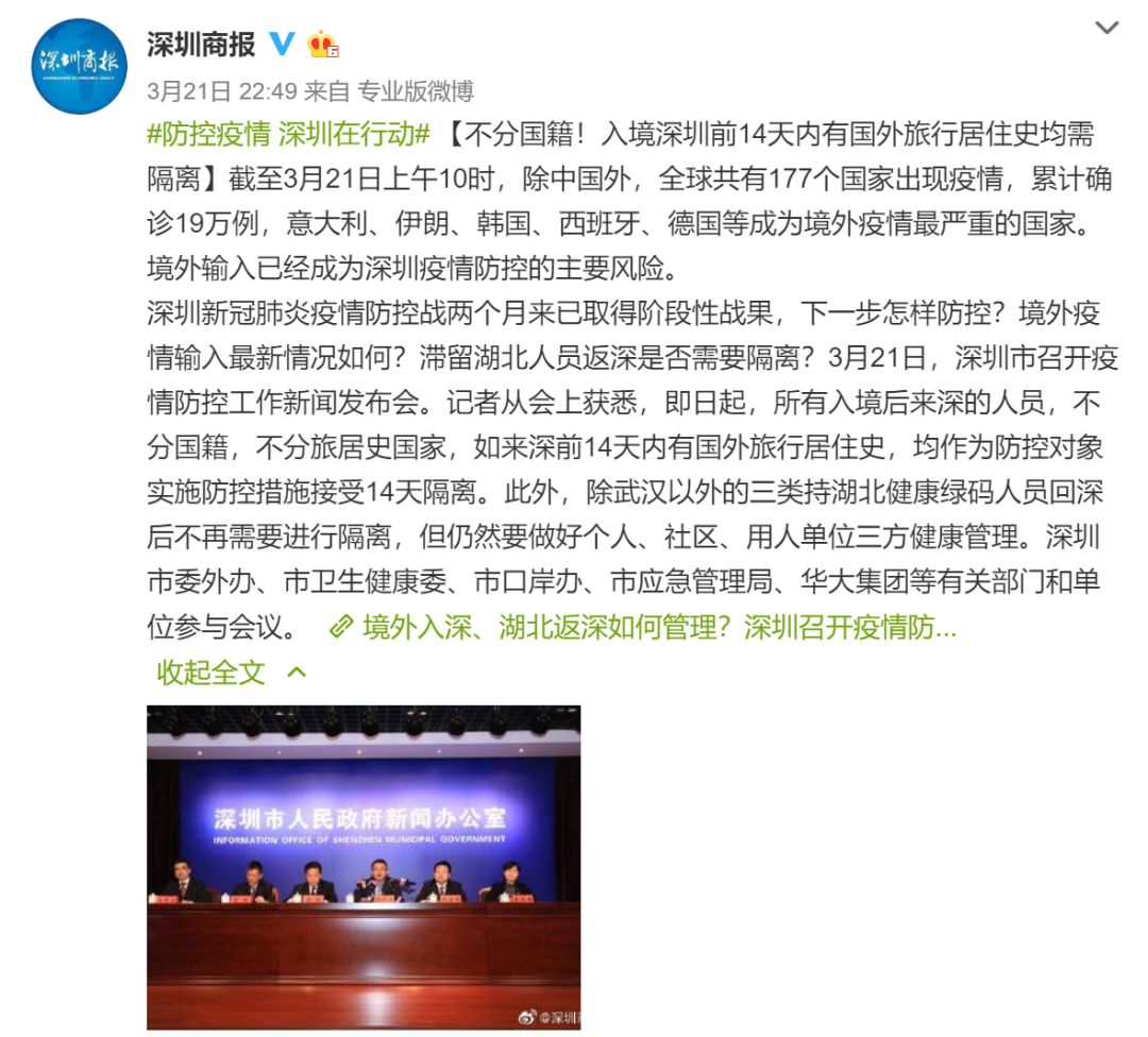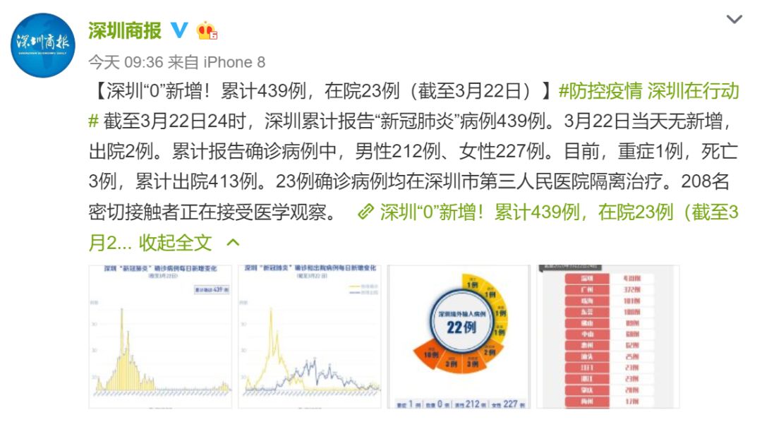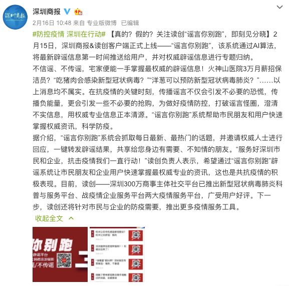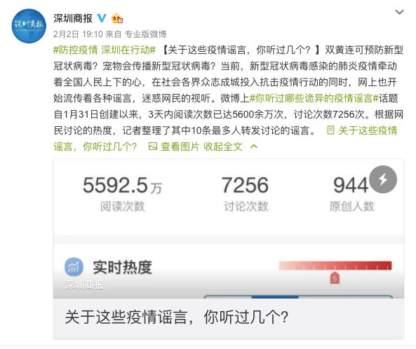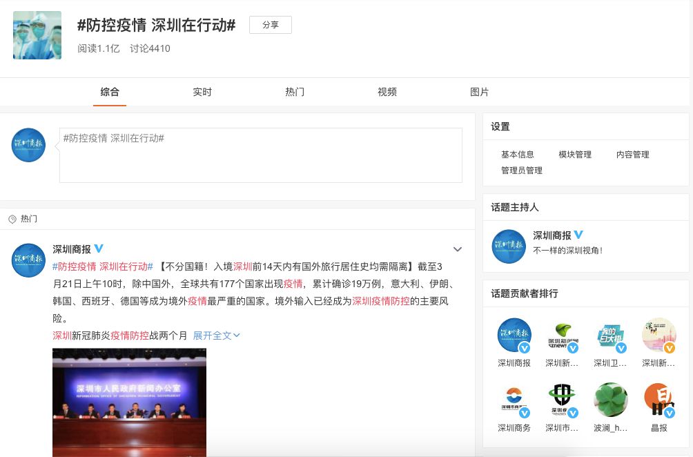 疫情发生初期,深圳商报微博创建话题 #防控疫情 深圳在行动# ,以高度的责任感和使命感全方位加强宣传报道和舆论引导,疫情相关信息均带话题发布,人们可以系统地查看疫情相关信息。