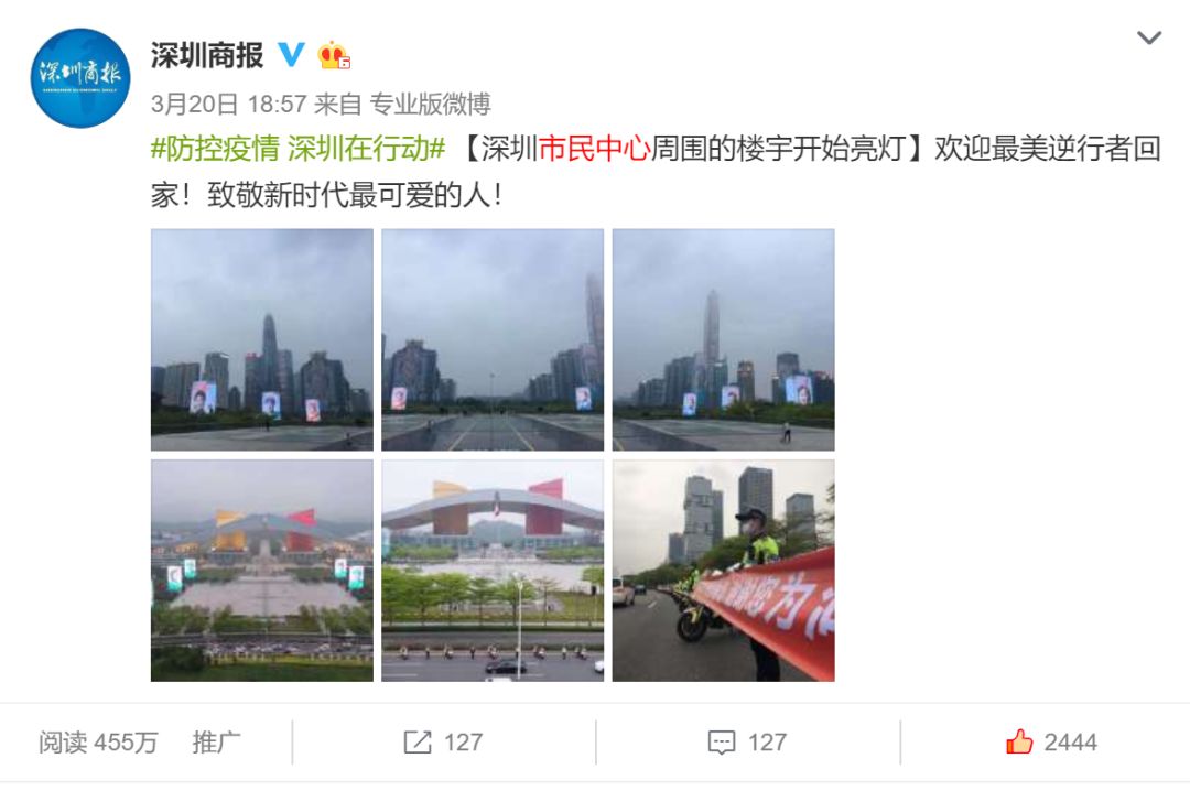 单条微博【深圳市民中心周围的楼宇开始亮灯】阅读数455万+,引起了广泛关注。