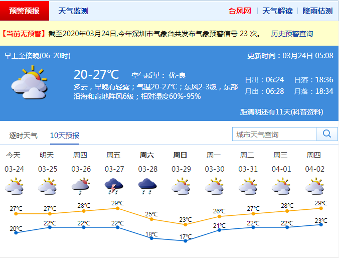 见圳客户端·深圳新闻网2020年3月23日讯 深圳今天多云,早晚有轻雾;气温20-27℃;东风2-3级,东部沿海和高地阵风6级;相对湿度60%-95%。