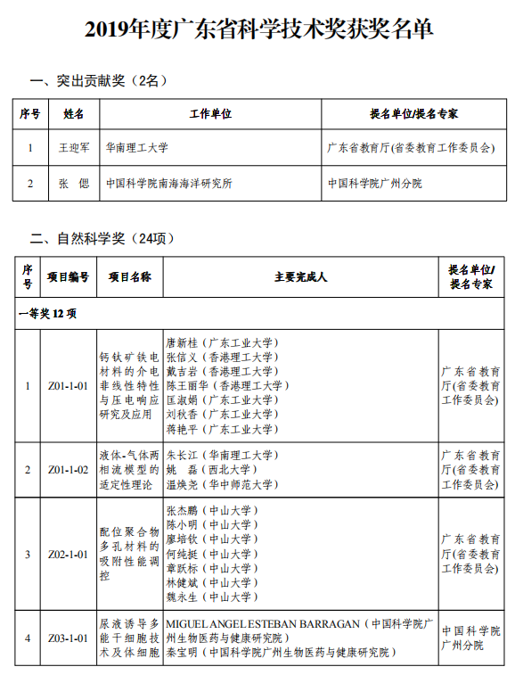 其中,2019年度广东省科学技术突出贡献奖的获奖者分别为:中国工程院院士、亚太材料科学院院士、华南理工大学教授王迎军;中国工程院院士,国内外著名海洋生态工程专家,中科院南海海洋研究所所长、研究员张偲。