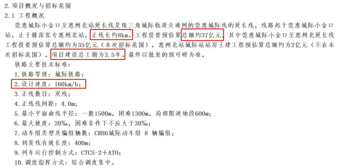 此间公示的莞惠城际小金口至惠州北站延长线,则是珠三角城际轨道交通网的莞惠城际线的延长线,线路起于莞惠城际小金口站,止于赣深客专惠州北站,正线长约8km,设计速度为160km/h。工程投资预估算总额约37亿元,其中莞惠城际小金口至惠州北延长线工程投资预估算总额约为35亿元(本次招标范围),惠州北站城际站站房土建工程预估算总额约为2亿元(不在本次招标范围)。