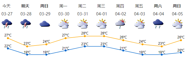 我市分散阵雨转雷雨,部分时间雨势较大;气温22-27℃;偏东风3级,雷雨时阵风可达8级左右;相对湿度60%-95%。