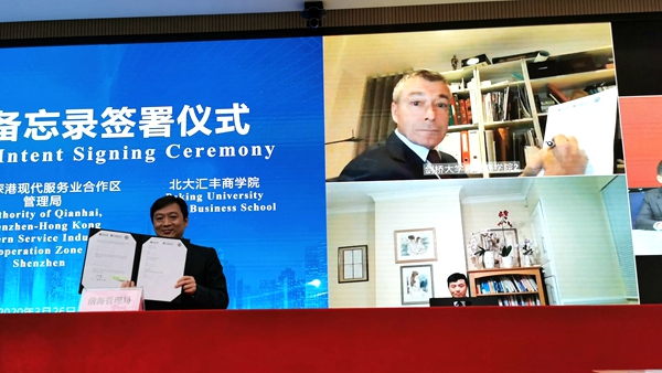 与以往不同,本次签约仪式采用了现场签约与视频连线“云签约”结合的特殊方式。前海管理局与中铁建资本控股集团有限公司,与国研科工、彩虹鱼,与北京大学汇丰商学院、剑桥大学嘉治商学院的合作采用了“云签约”。