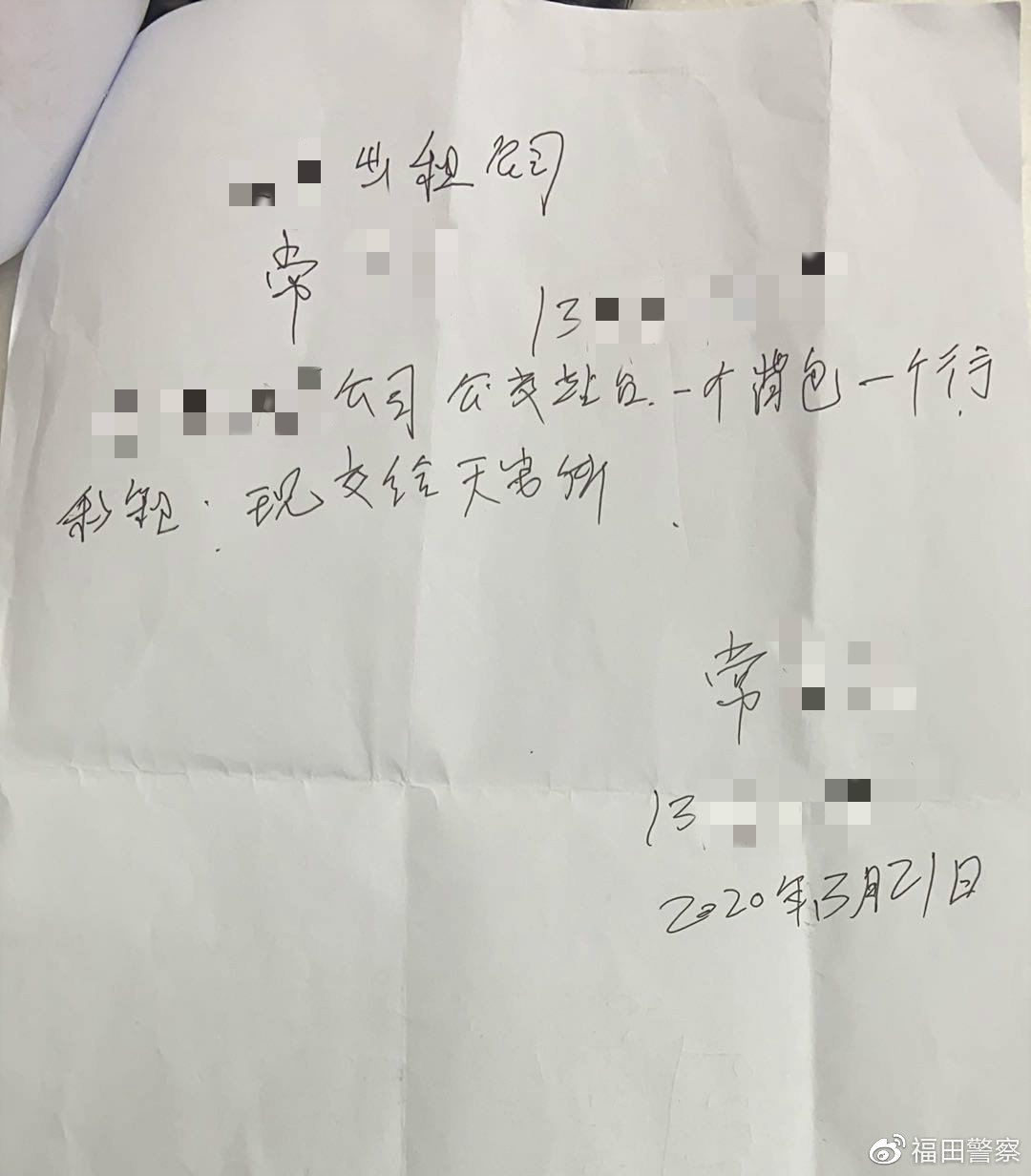 3月21日晚,一辆的士开到深圳市公安局福田分局天安派出所门口,的士司机从车上拿下来一个黑色的背包和银色的行李箱到前台。