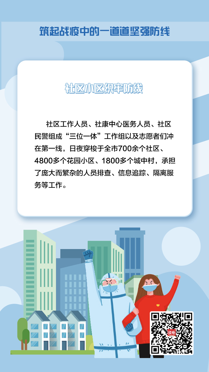 社区小区是“外防输入、内防扩散”的有效防线,在这个关键战场上,由社区工作人员、社康中心医务人员、社区民警组成的“三位一体”工作组以及志愿者们冲在第一线,日夜穿梭于全市700余个社区、4800多个花园小区、1800多个城中村,承担了庞大而繁杂的人员排查、信息追踪、隔离服务等工作。