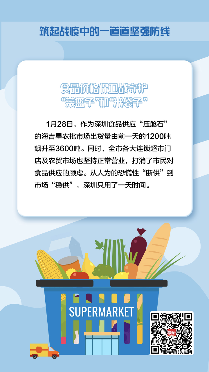 面对抗击疫情早期出现的市场不稳定情况,深圳市场监管部门果断出手,提出保价格、保质量、保供应的“三保”策略,一手筑牢食品农产品供应链,一手重振防疫物资供给链,以充足的物资补给,将食品和防疫物资的价格稳定在正常水平上。