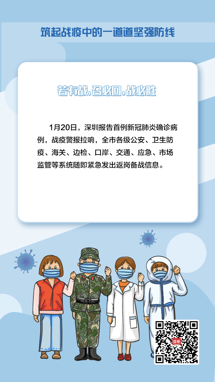 “在深圳的各位同事请立即返岗。各单位请马上通知休假人员,落实人员归队。”1月20日,深圳报告首例新冠肺炎确诊病例,战疫警报拉响,全市各级公安、卫生防疫、海关、边检、口岸、交通、应急、市场监管等系统随即紧急发出返岗备战信息。
