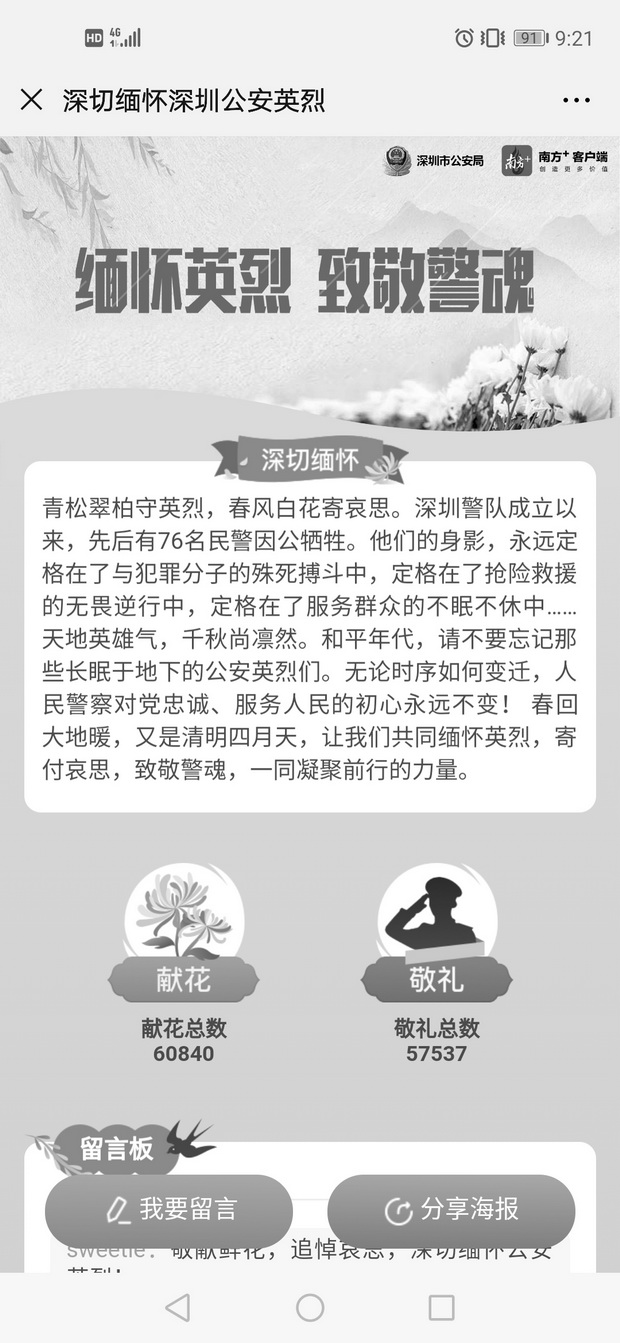见圳客户端、深圳新闻网2020年4月4日讯(见圳客户端、深圳新闻网记者 张喆 通讯员 张奎)清明忆英烈,哀思祭忠魂。4月3日,在清明节来临之际,为缅怀公安英烈、致敬忠诚警魂,深圳市公安局以“网上祭扫”的形式,在网络上开展公安英烈缅怀活动。