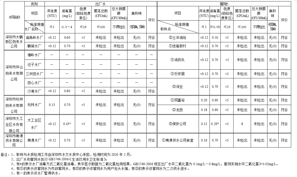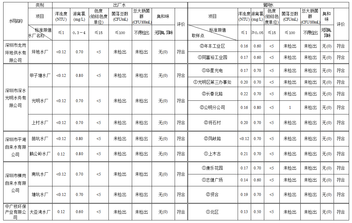 见圳客户端·深圳新闻网2020年4月4日讯(见圳客户端、深圳新闻网记者叶梅)2020年2月,深圳市水务局对全市42个水厂出厂水水样以及68个管网水水样进行了抽检。检测结果表明,依据GB5749—2006《生活饮用水卫生标准》,所有受检42个出厂水水样和68个管网水水样的浑浊度、消毒剂(游离氯或二氧化氯或总氯)、色度、菌落总数、总大肠菌群及臭和味共6项常规指标全部符合该标准的规定,出厂水水样合格率为100%,管网水合格率为100%。