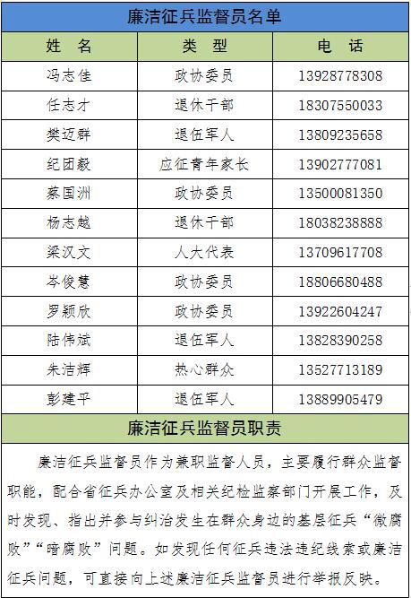 为深入贯彻党风廉政建设有关要求,有效维护广大应征青年的合法权益,增强征兵工作透明度,自觉接受人民群众监督,保证全省征兵工作公开、公平、公正,现将2020年广东省人民政府征兵办公室廉洁征兵监督员及监督举报电话、邮箱予以公布,欢迎社会各界对征兵工作进行监督。