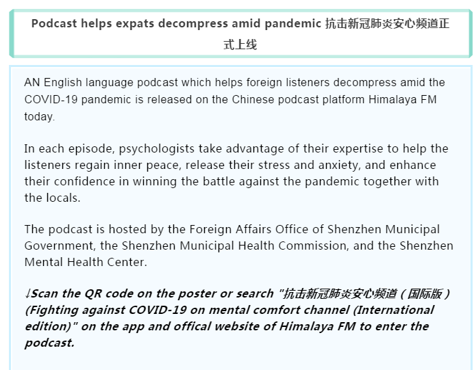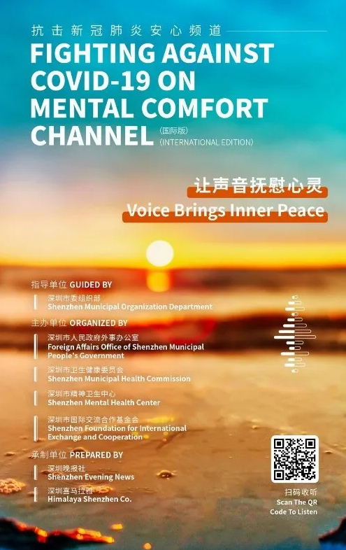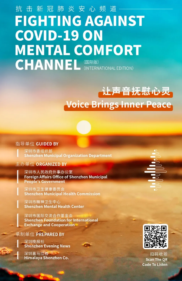 在疫情面前,每一份信念都意义重大,每一个希望都影响深远。4月11日,抗击新冠肺炎安心频道(国际版)在喜马拉雅 APP正式上线。该栏目在深圳市委组织部的指导下,由深圳市外办携手深圳市卫健委、深圳市精神卫生中心、深圳市国际交流合作基金会联合出品,由深圳晚报和深圳喜马拉雅共同承制。据悉,抗击新冠肺炎安心频道(国际版)是深圳市外办首次联合多部门协作,共同出品的全英文音频栏目,也是继"抗击新型肺炎安心手册音频版"推出以来的又一大创新。该栏目的推出体现了深圳对中外居民的人文关怀,也展现了深圳作为国际化城市的温暖大爱。