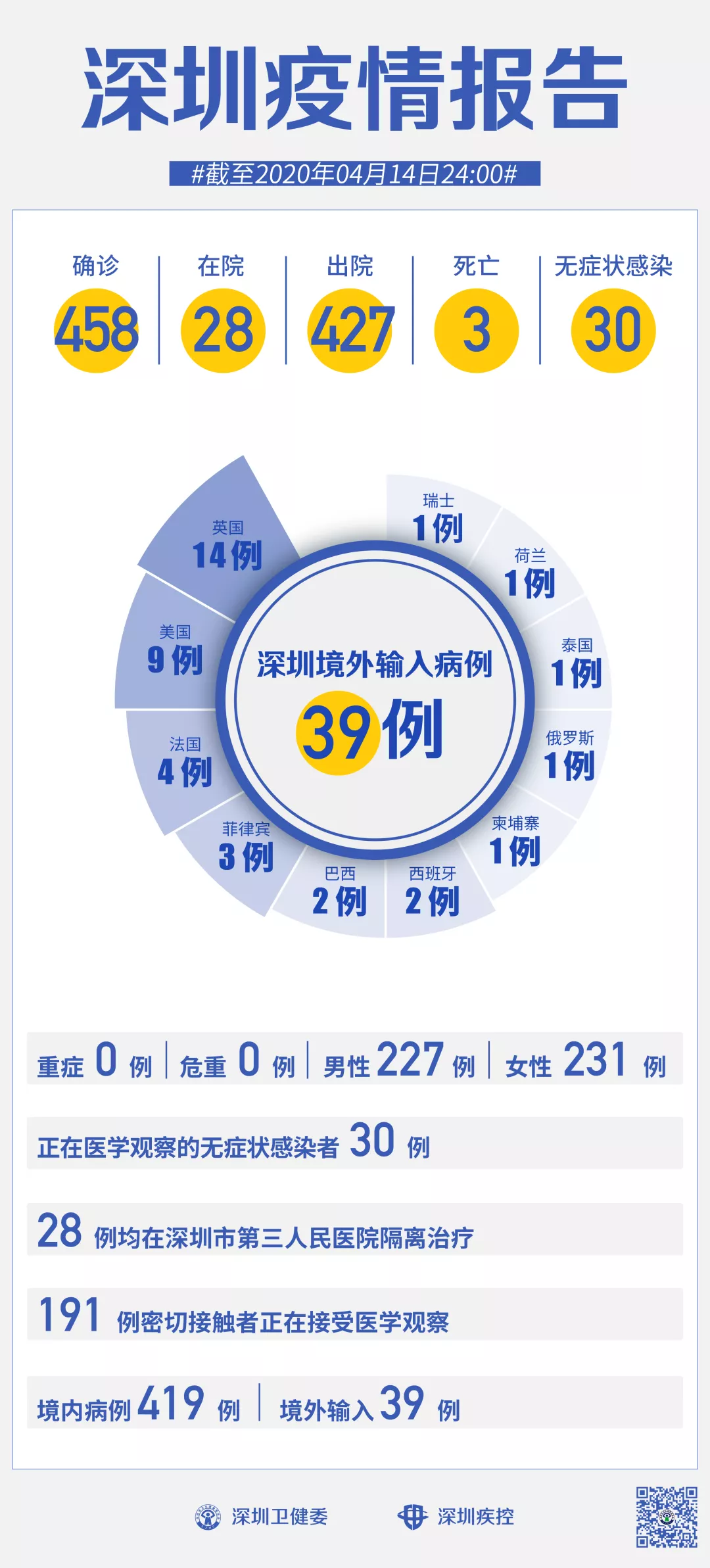 截至4月14日24时,深圳累计报告新冠肺炎病例458例。4月14日当天新增出院3例。