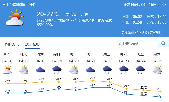 见圳客户端·深圳新闻网2020年4月16日讯 我市今天到明天多云间晴天,16日早晚有轻雾,气温20-27℃;南风2级;相对湿度65%-90%。早晚稍凉,午间体感较热,注意及时增减衣物;出门要注意防晒,户外活动需注意及时补充水分。