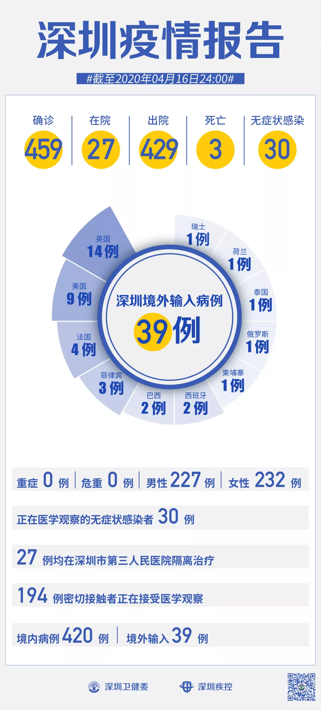 截至4月16日24时,深圳累计报告新冠肺炎病例459例。4月16日当天新增境内病例1例,新增无症状感染者1例。