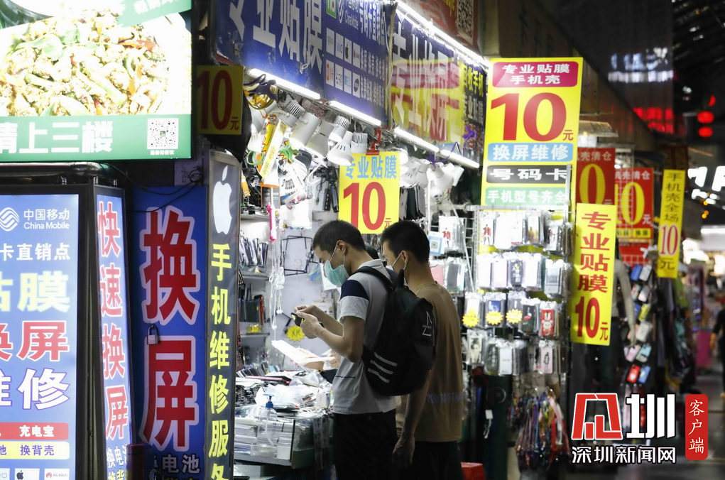 东门步行街的手机配件门店前,两位市民正在选购。