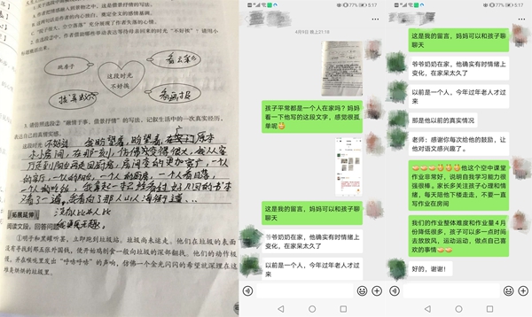 疫情来的迅猛又猝不及防,老师们一方面要完成教学任务、引导学生做好防疫,一方面要时刻关注学生的心理健康。学生们被迫在家度过了一个史上最长的寒假,对于处在叛逆期的孩子们来说,难免会与家人出现一些矛盾,在课堂之外,老师们还需要担任“心理调节师”的角色。一次,周老师班上有个同学因为上网课的事情与父母闹了矛盾,一气之下跑到奶奶家,周老师得知了这件事情,第一时间联系上学生,通过鼓励、引导,让学生认识到自己的错误,与父母和解。还有一次,周老师通过批改作业,发现一名学生在作业中吐露了自己孤独、无趣的心声。看到后,周老师立刻与家长沟通了解情况,并建议家长多多陪伴孩子。尽管老师和学生们不能在学校的课堂上相聚,但在通讯十分发达的现在,老师们也始终用自己的方式陪伴在学生左右。