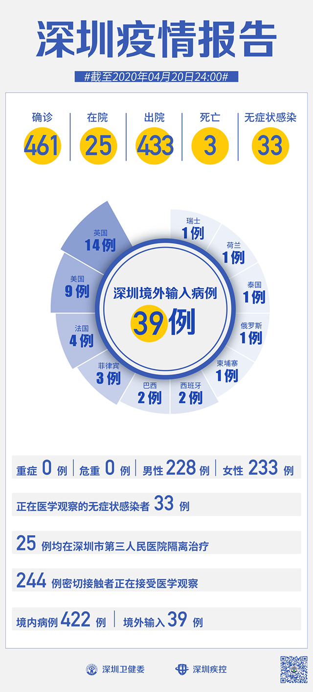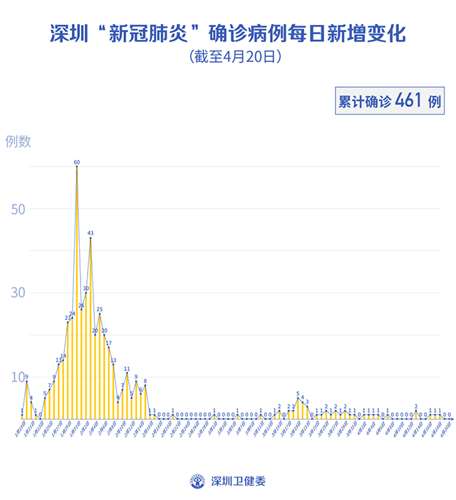 截至4月20日24时,深圳累计报告新冠肺炎病例461例。4月20日当天新增出院1例。