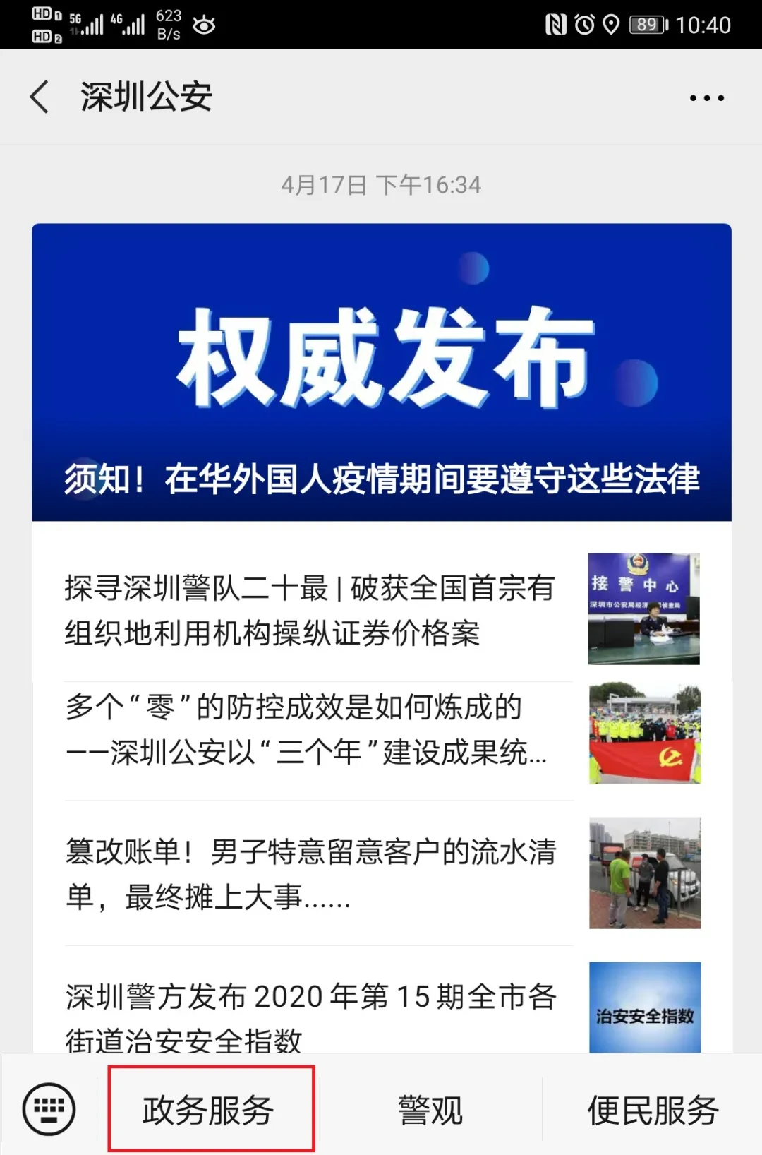 1、关注“深圳公安”,点击“政务服务”;