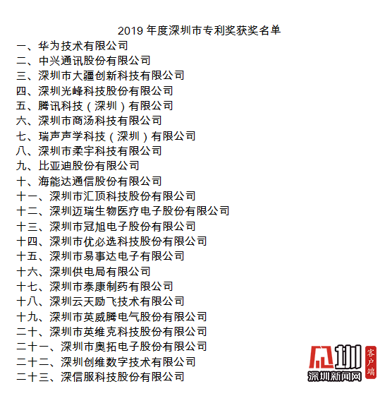 会议同期还发布了2019年度深圳市专利奖获奖企业名单,华为技术有限公司、中兴通讯股份有限公司、深圳市大疆创新科技有限公司、深圳光峰科技股份有限公司、腾讯科技(深圳)有限公司、深圳市商汤科技有限公司、瑞声声学科技(深圳)有限公司等23家单位获奖。