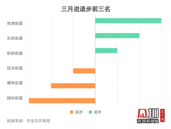 2020年一季度各街道数据显示,桃源街道、黄贝街道和南湖街道空气质量排名始终保持在前十位,而马田街道、新安街道、观澜街道、福城街道、笋岗街道、沙河街道、华强北街道和沙井街道空气质量排名连续三次垫底。