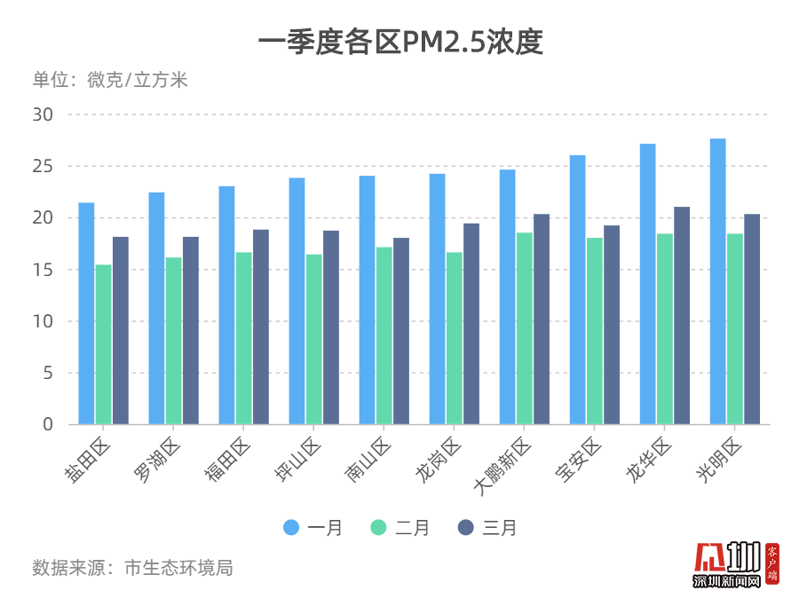 2020年一季度整体数据显示,各区一月份的PM2.5浓度数值相对较高,二月份均有所下降,三月份数值又有所回调。罗湖区和盐田区空气质量排名连续位列三甲,而光明区空气质量排名连续位于末端。
