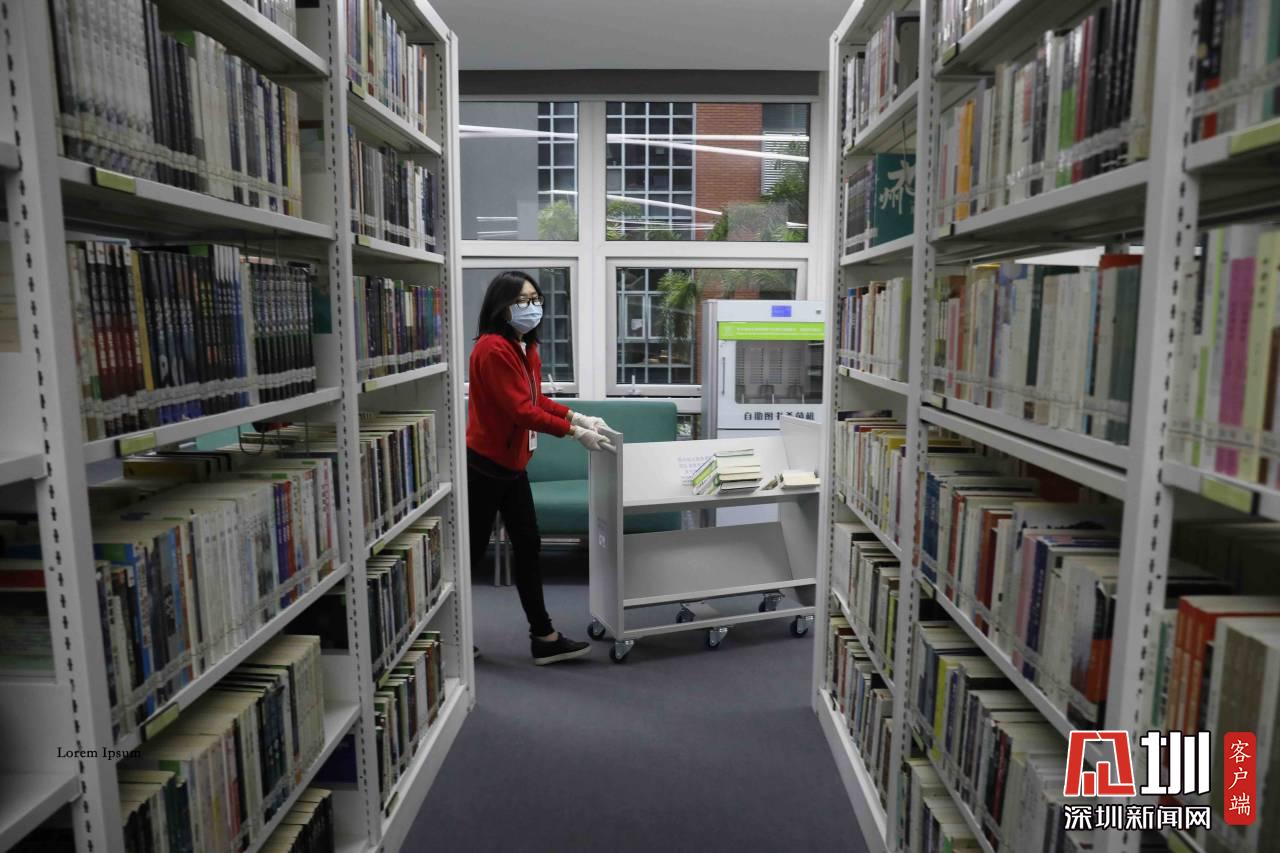 一位工作人员正在将需要上架的书籍推到指定位置。