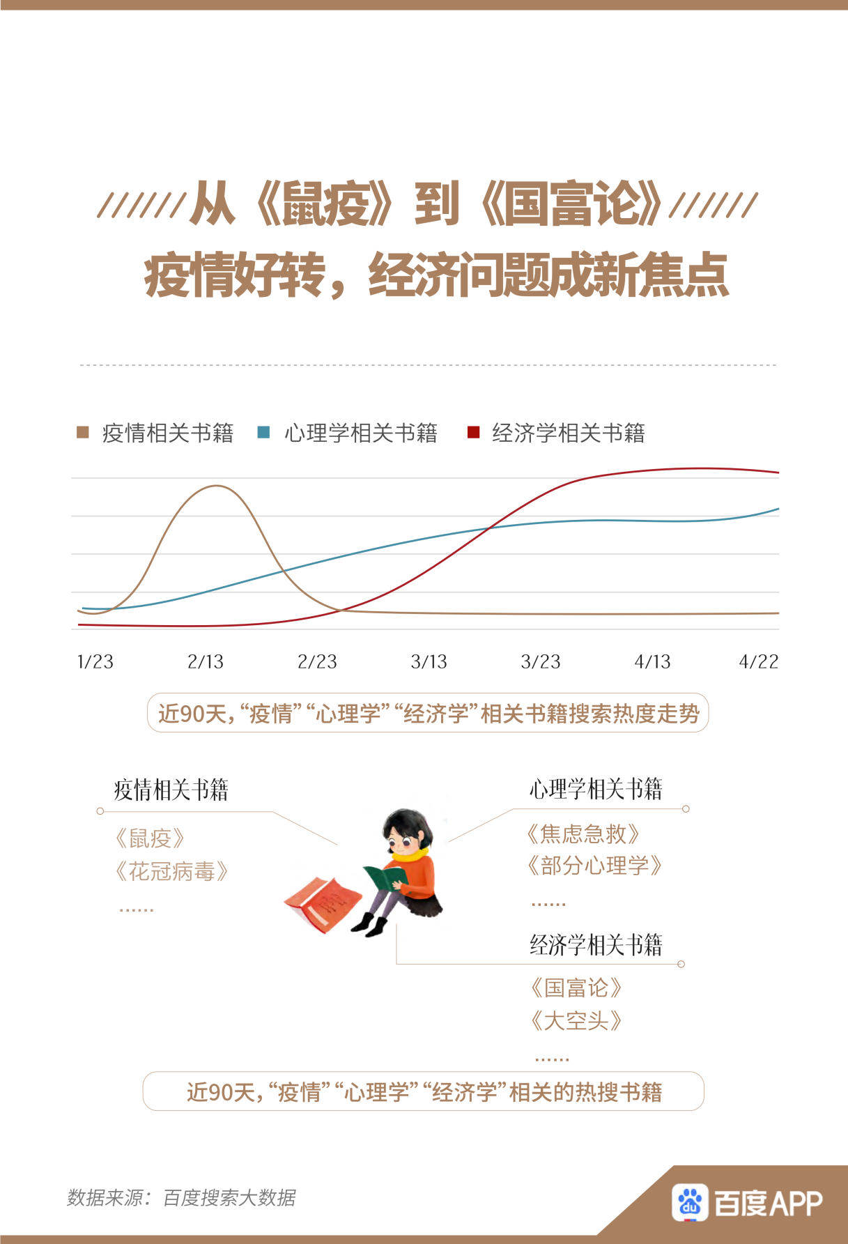 与此同时,疫情变化也影响着人们的阅读“口味”。报告显示,在疫情暴发之初,与“疫情”相关书籍的搜索热度迅速上升,《鼠疫》、《花冠病毒》等具有疫情背景的书籍成为热搜。随着国内疫情好转,疫情对心理、经济的影响逐渐受到人们更多关注,《焦虑急救》、《国富论》等“心理学”、“经济学”相关书籍的搜索热度均在3月上涨。