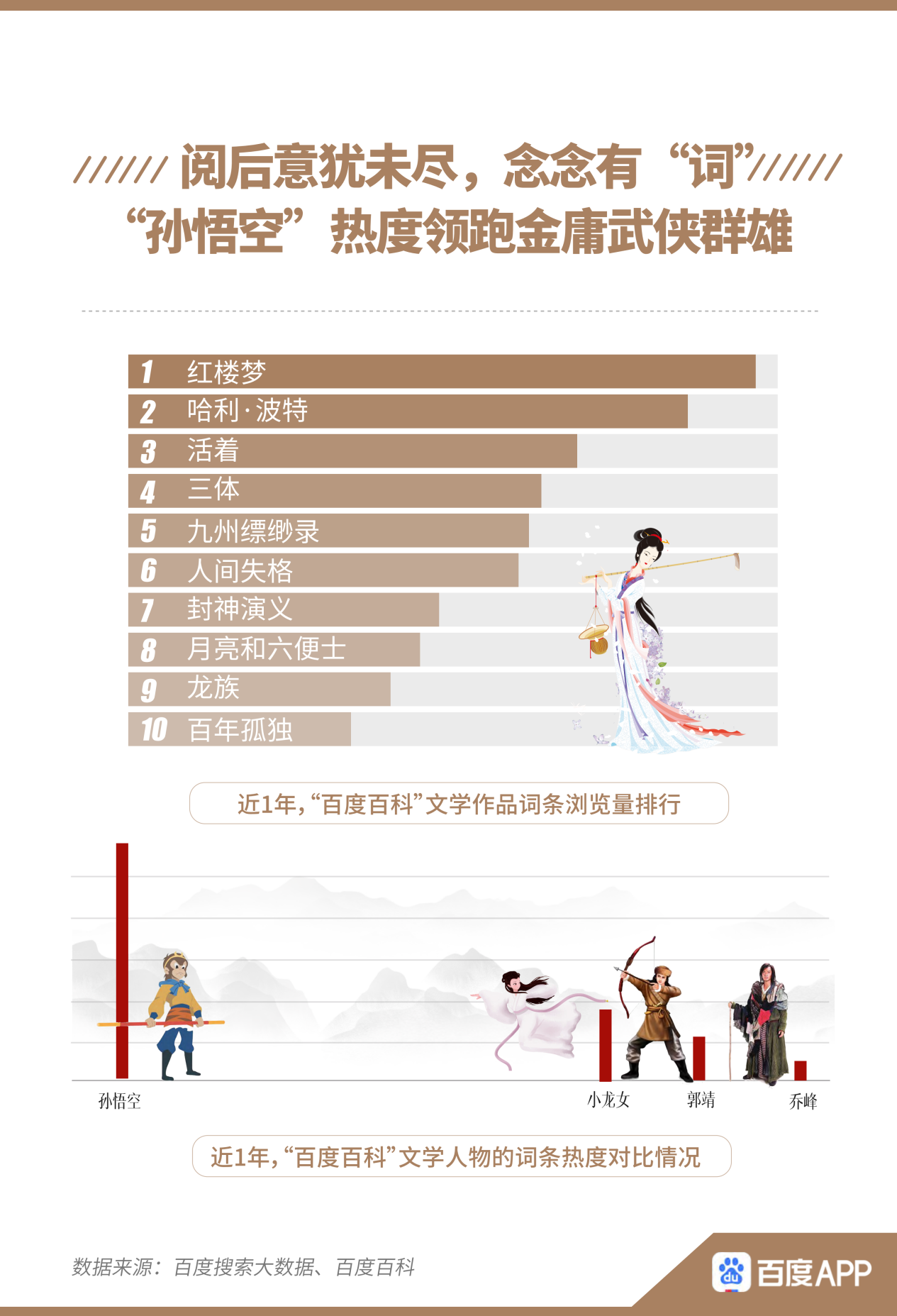 而百度百科的数据表明,人们在阅读经典书籍后,点击词条查看更多背景、释义也是常态。《红楼梦》、《哈利·波特》、《活着》、《三体》是近1年来网友在百度百科浏览较多的文学作品相关词条。