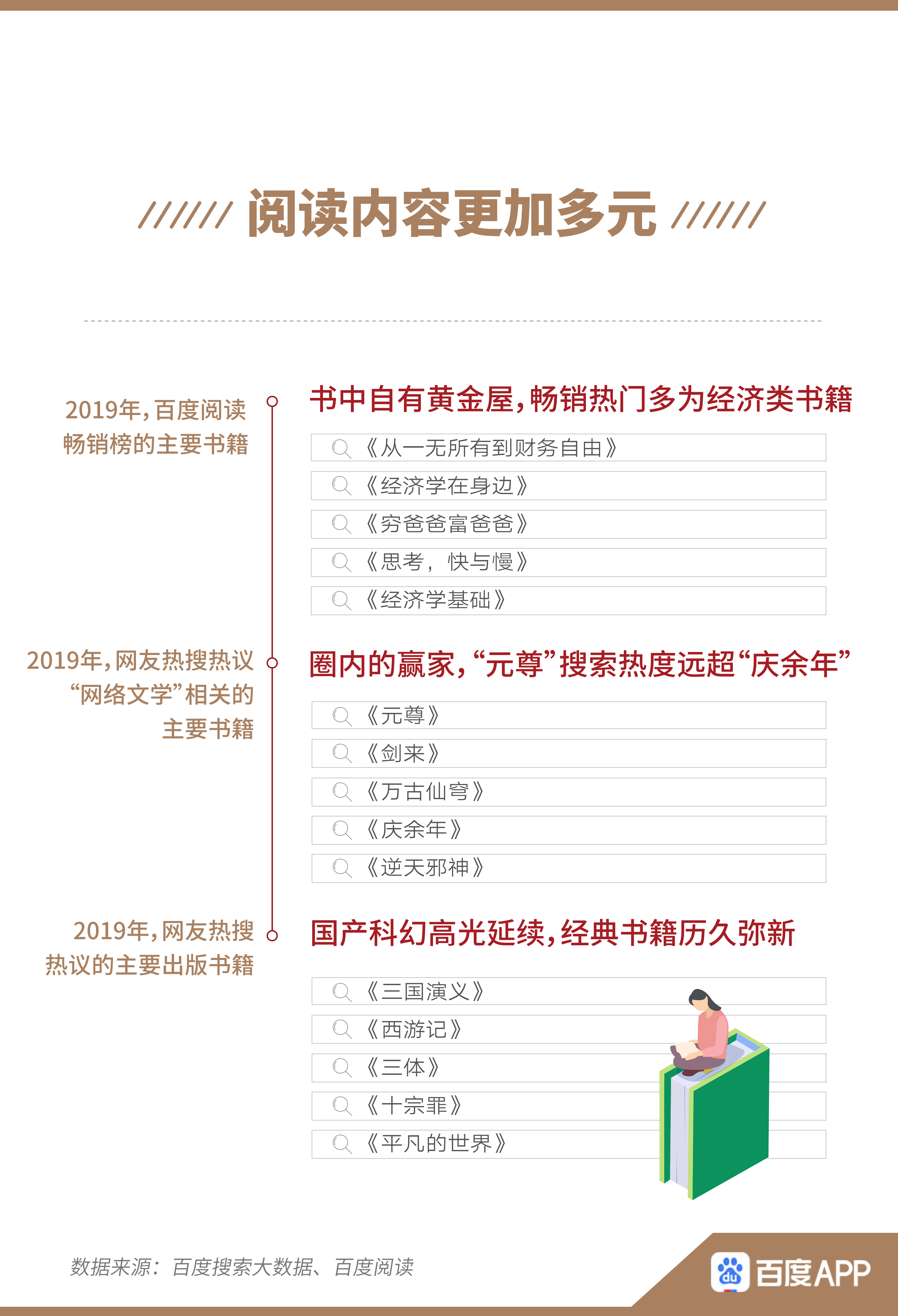 阅读既有不同地域、年龄、性别等产生的差异,也有明显的兴趣趋势。报告指出,百度阅读2019年畅销热门多为经济类书籍,人们学习理财投资的意识增强。“网络文学”体现出强大的“圈层”能量,即便已破圈的《庆余年》,其搜索热度依旧不敌《元尊》。而在网友热搜热议的主要出版书籍中,《三国演义》、《西游记》等经典书籍历久弥新,位居前列。