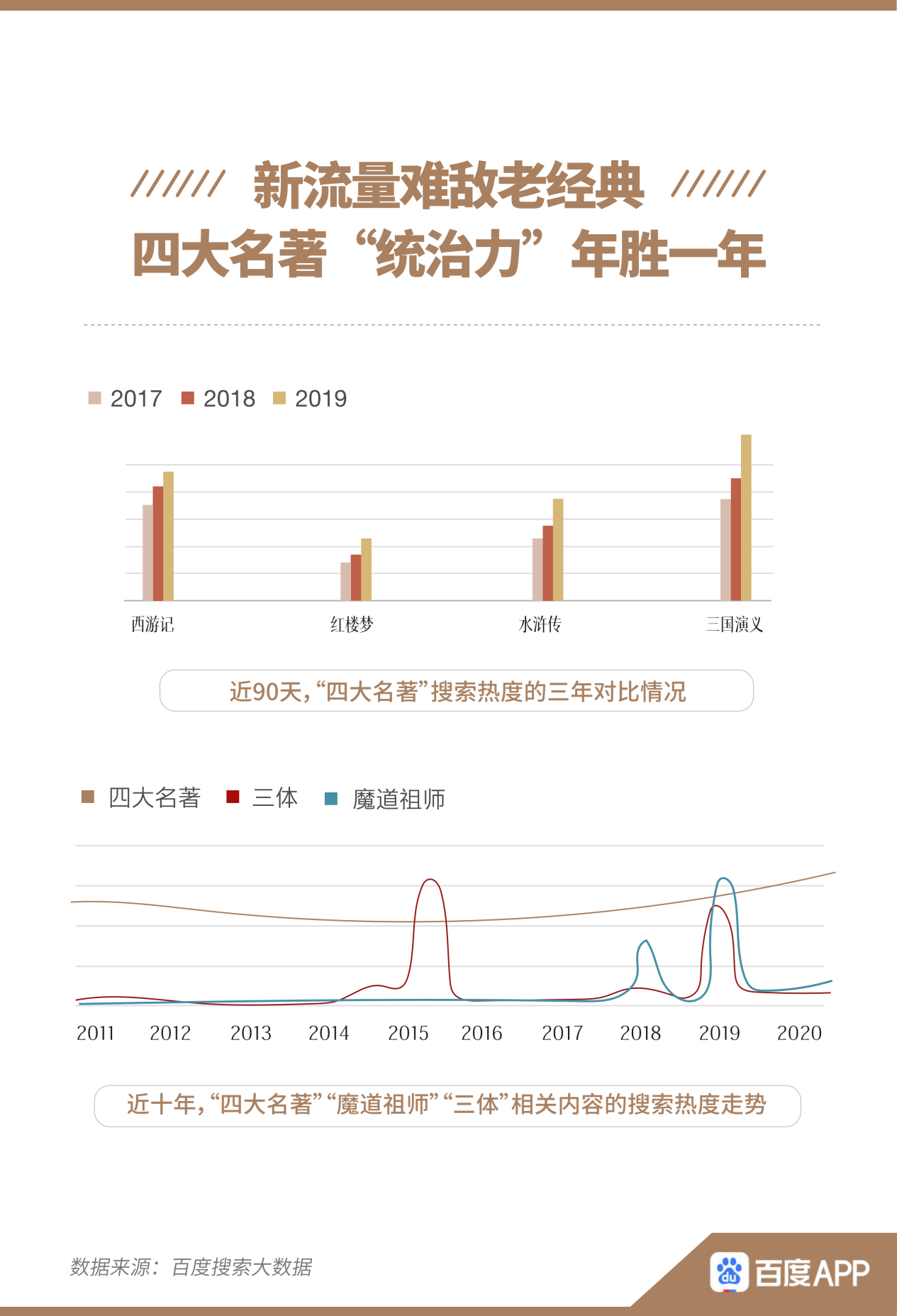 报告指出,近90天,“四大名著”搜索热度的三年对比情况呈现出年年上升的趋势,对比如《三体》、《魔道祖师》等近年的热门书籍,四大名著搜索热度走势更加稳定向上,体现出强大的“统治力”。