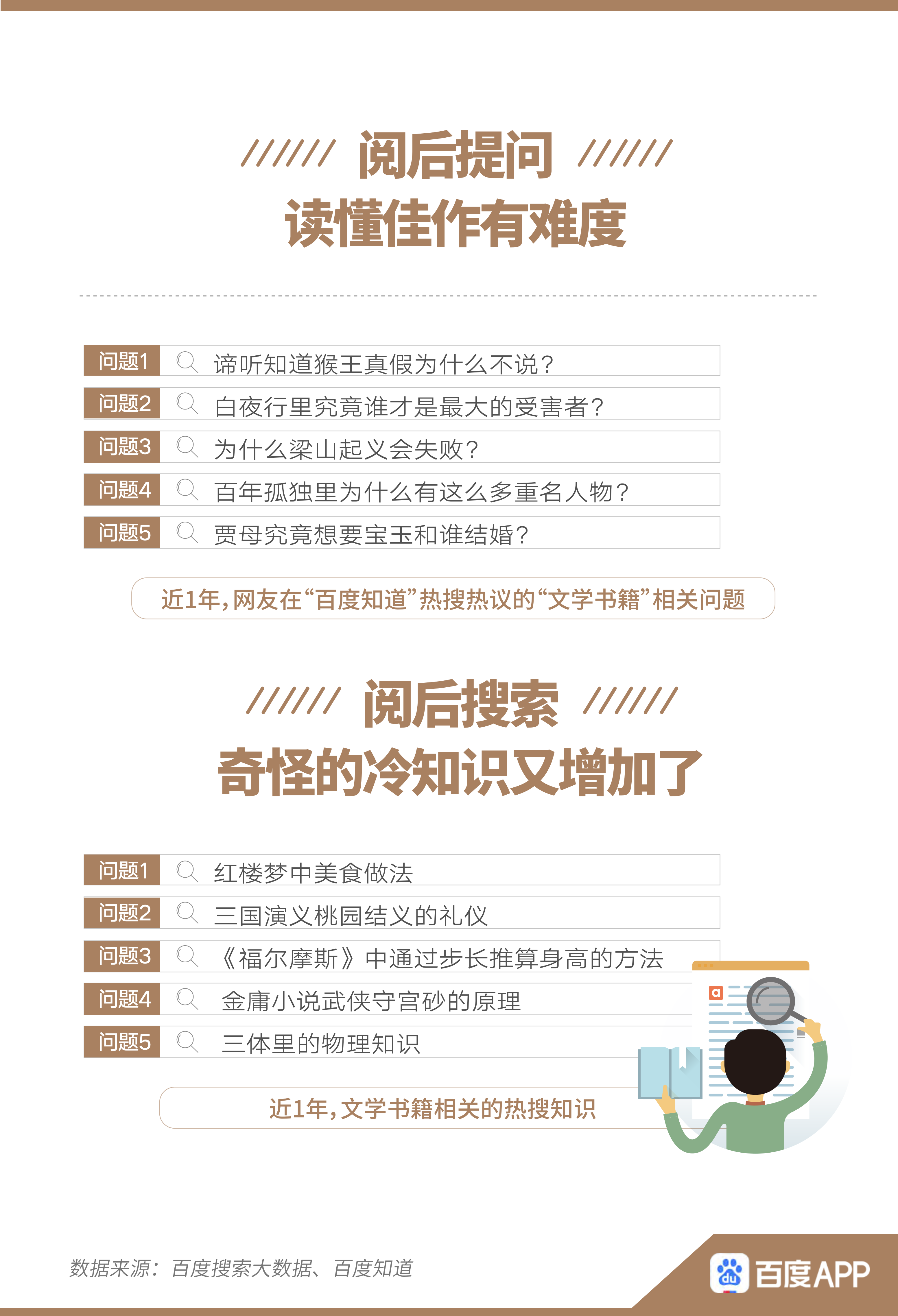 阅后提出对书籍的疑惑、讨论思考、参与表达,均是读者的重要需求。报告显示,近1年,不少网友在阅读之后,选择到百度知道提问、讨论。例如,“谛听知道猴王真假为什么不说”、“白夜行究竟谁是最大受害者”等情节相关问题,均引起网友的热搜热议。除此之外,在百度搜索与主要情节无关的“冷”知识的人也不在少数,如“红楼梦中美食做法”、“三体里的物理知识”等。
