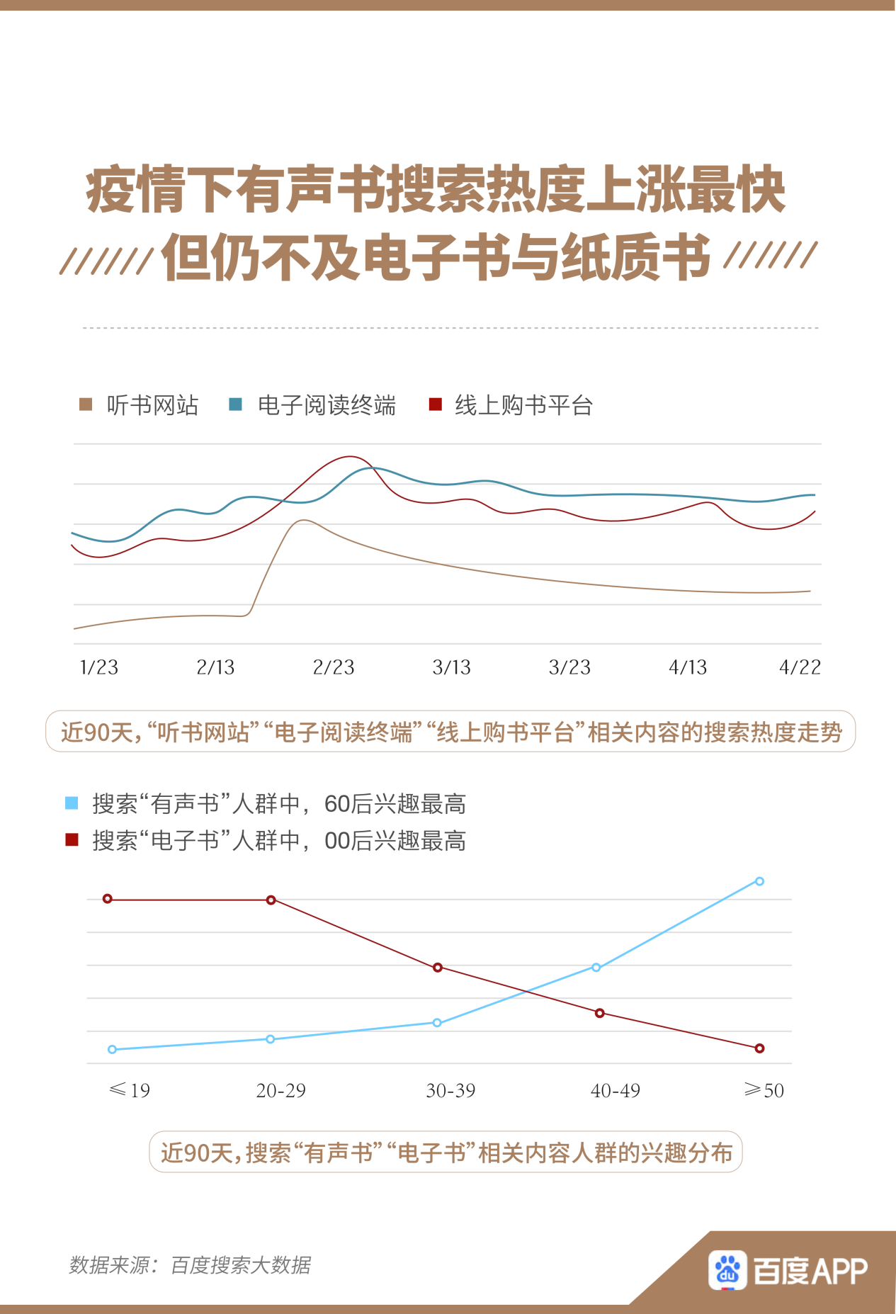 此外,在阅读方式上,不同年龄也出现不同的偏好。疫情之下,“听书网站”相关内容的搜索热度上涨趋势明显,但未能超越“电子阅读终端”、“线上购书平台”。在搜索“有声书”人群中,60后的兴趣最高,00后则更能接受“电子书”。